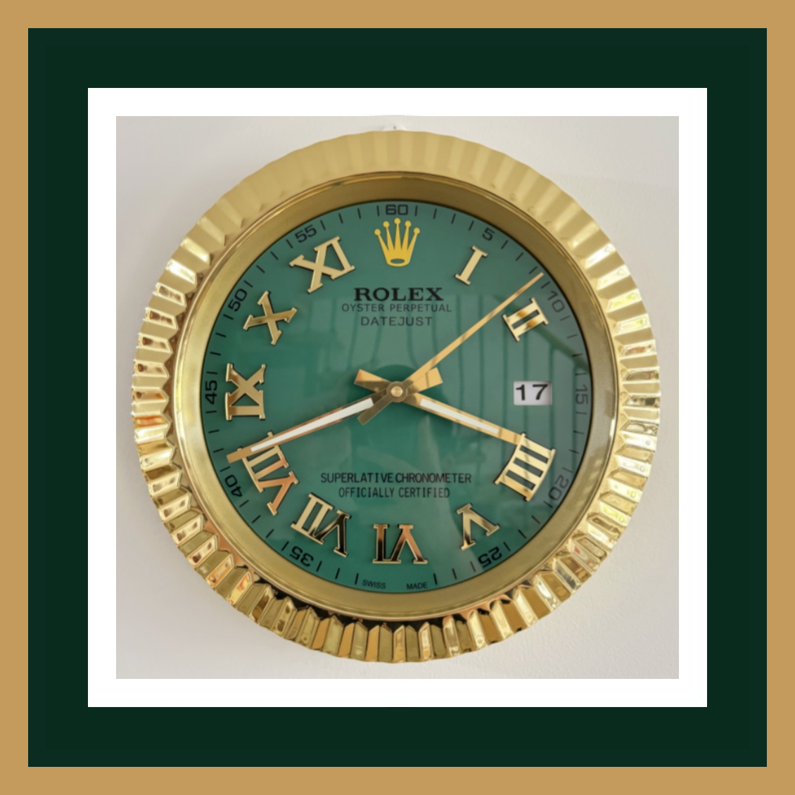 The Swiss Quality Datejust Green Dial Roman Numerals Gold Wall Clock is a symbol of refinement and prestige.